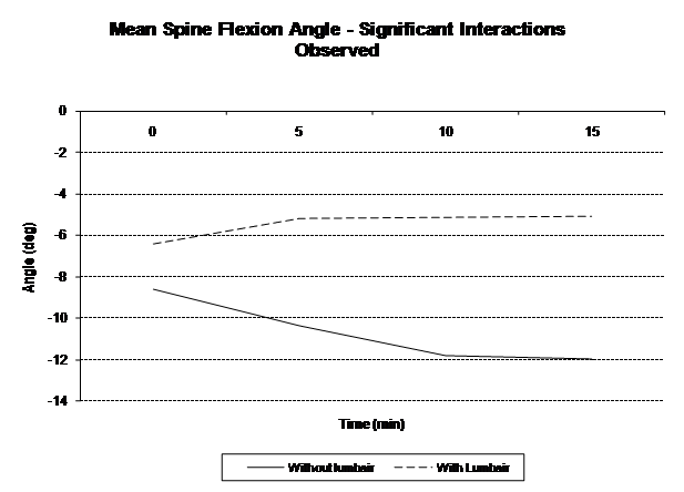 Spine flexion was significantly larger at the beginning of condition 1 (without the LumbAIRPlus) than at the beginning of condition 2 (with the LumbAIRPlus), as well as at after 5, 10 and 15 minutes of sitting (F = 6.24, p = 0.0085). Also at the start of condition 1, the spine angle is significantly less flexed than after 10 and 15 minutes of sitting without the LumbAIRlus (F = 6.24, p = 0.0085). There are no significant differences in the spine angle over the 15 minute trial when using the LumbAIRPlus.